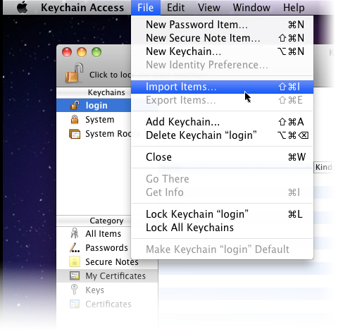 Unter Schlüsselbunde wählen Sie bitte Login aus und unter Kategorie klicken Sie anschließend auf Meine Zertifikate. Klicken Sie nun auf Ablage und wählen Sie Objekt importen aus.